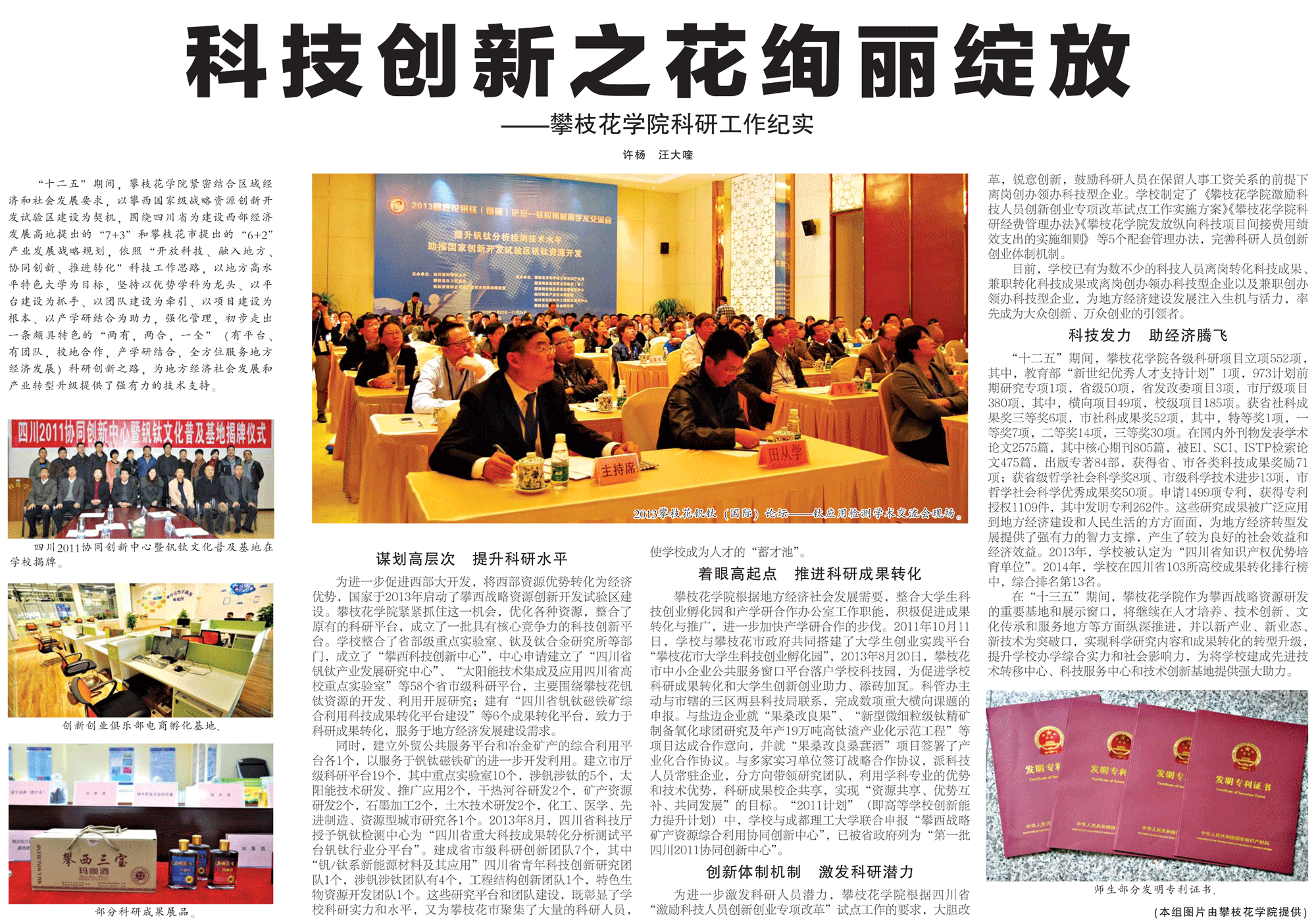“十二五”期间,攀枝花学院紧密结合区域经济和社会发展要求,以国家级攀西战略资源创新开发试验区建设为契机,围绕四川省人民政府为建设西部经济发展高地而提出的“7+3”和攀枝花市人民政府提出的“6+2”产业发展战略规划,依照“开放科技、融入地方、协同创新、推进转化”科技工作思路,以地方高水平特色大学为目标,坚持以优势学科为龙头、以平台建设为抓手、以团队建设为牵引、以项目建设为根本,以产学研结合为助力,强化管理,已初步走出一条颇具特色的“两有,两合,一全”(有平台、有团队,校地合作,产学研结合,全方位服务地方经济发展)的科研创新之路,为地方经济社会发展和产业转型升级提供了强有力的技术支持。